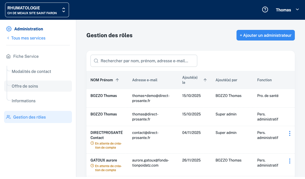 L’onglet Gestion des rôles d’une fiche service ou établissement centralise la liste des administrateurs habilités à modifier la fiche. Cet article vous explique comment la lire.