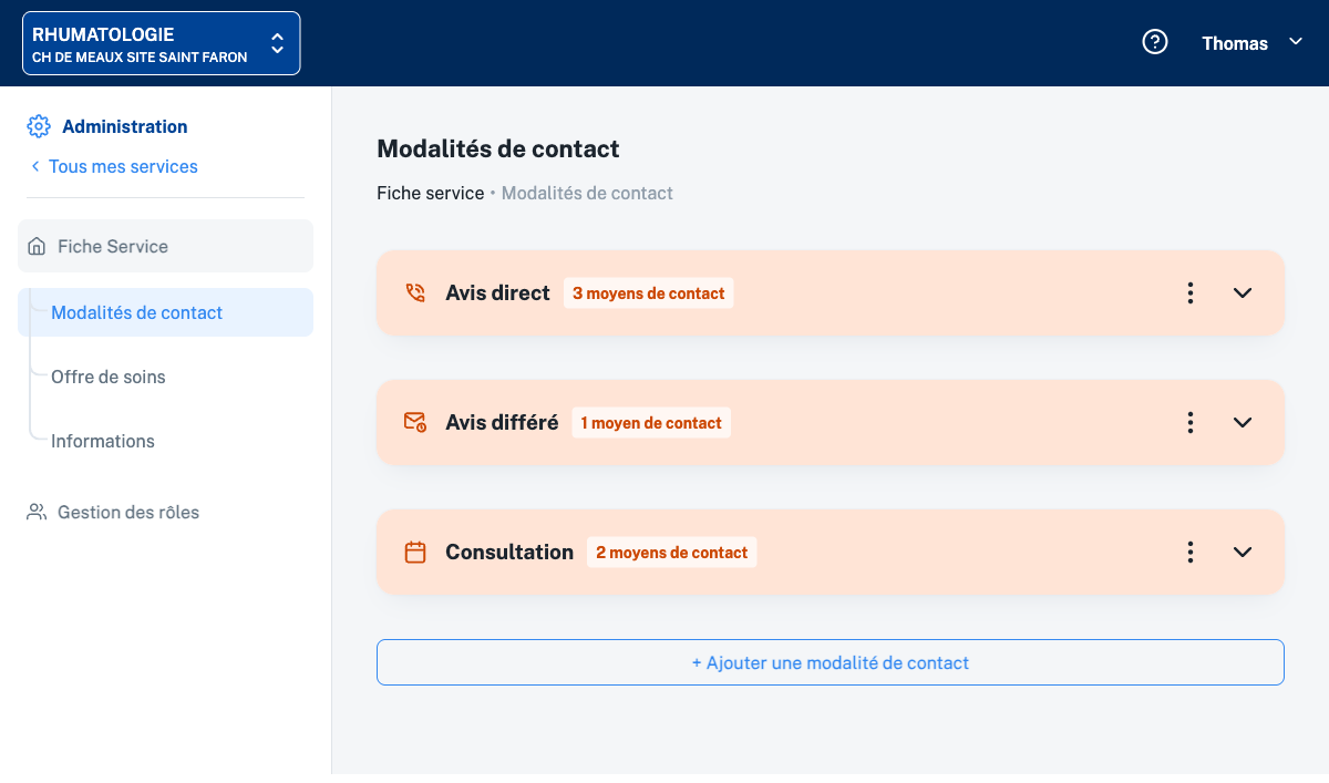 Depuis la fiche admin de votre service, cliquez sur l’onglet Modalités de contact dans la sidebar.