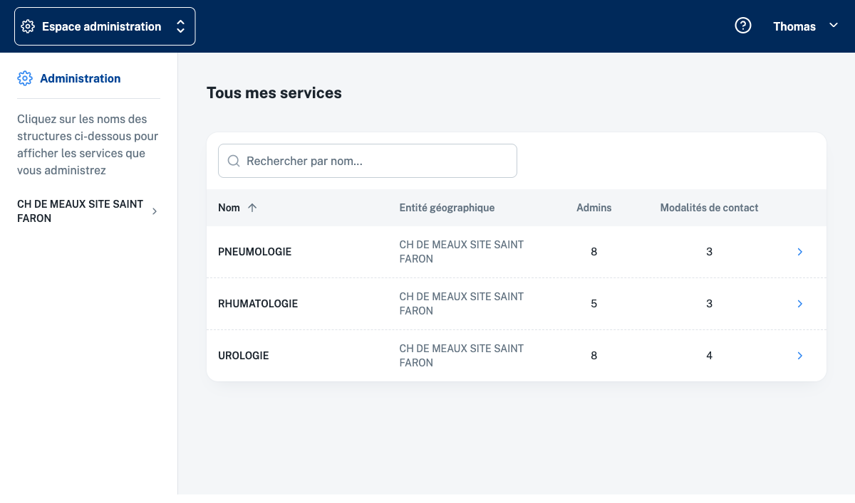 - “Cliquez sur les noms des structures ci-dessous pour afficher les services que vous administrez” : une courte phrase d’aide.
