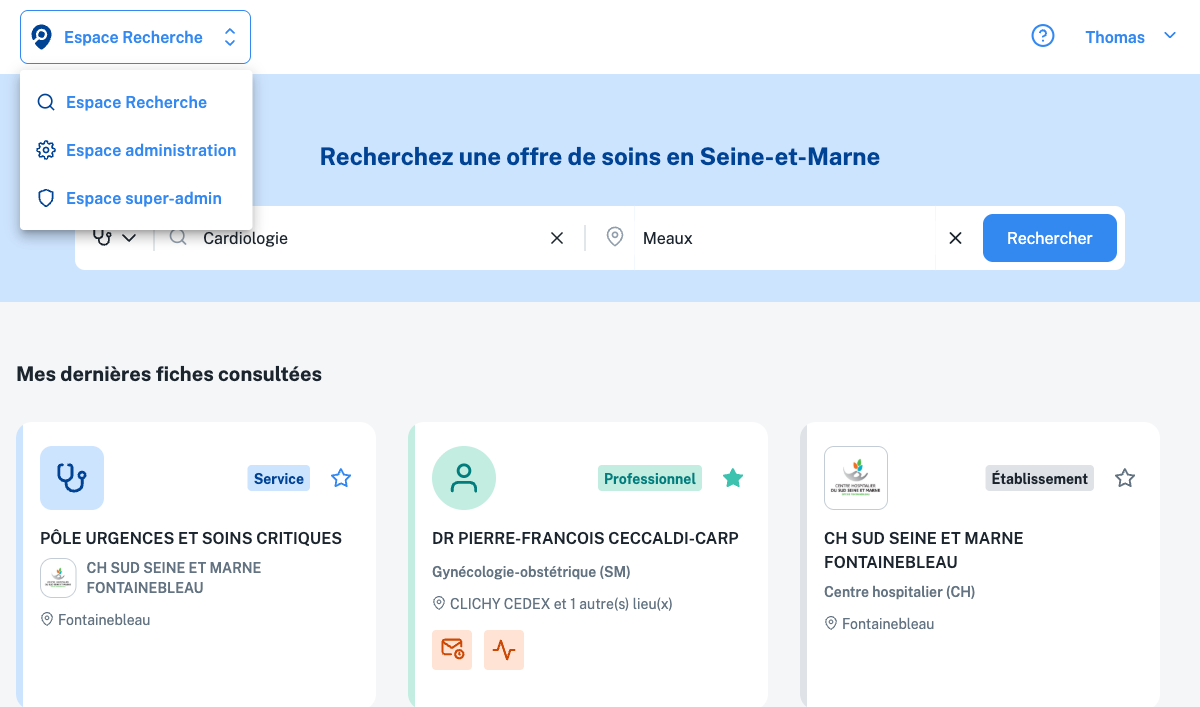 En haut à gauche de toutes les pages de DirectProSanté 77, un bouton affiche le nom de l’espace actuellement ouvert (par défaut Espace Recherche) suivi de deux flèches haut/bas. Cliquez dessus pour ouvrir le menu de bascule : vous voyez les espaces auxquels votre compte a accès.