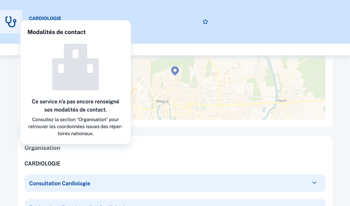 Certaines fiches n’ont pas encore été enrichies par leur administrateur. Dans ce cas, la carte Modalités de contact affiche un état vide :