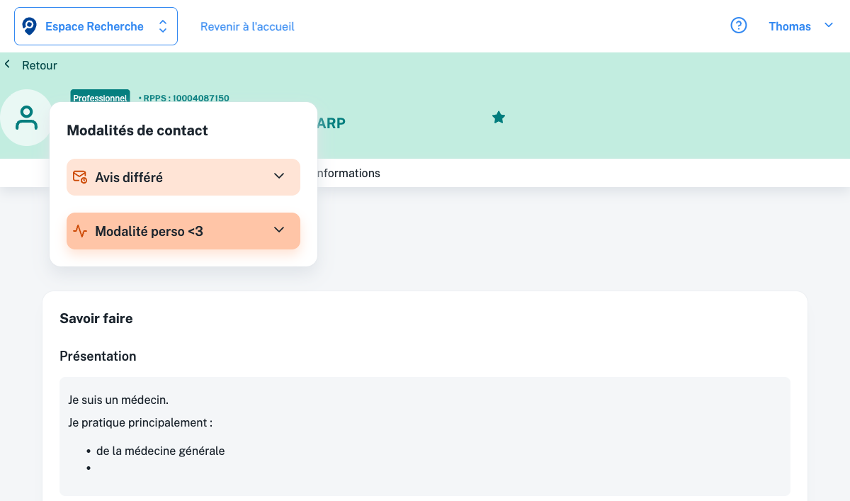 Comme pour une fiche service, les modalités de contact du praticien (avis direct, avis différé, consultation, secrétariat) sont affichées et dépliables. Voir Comprendre les modalités de contact.