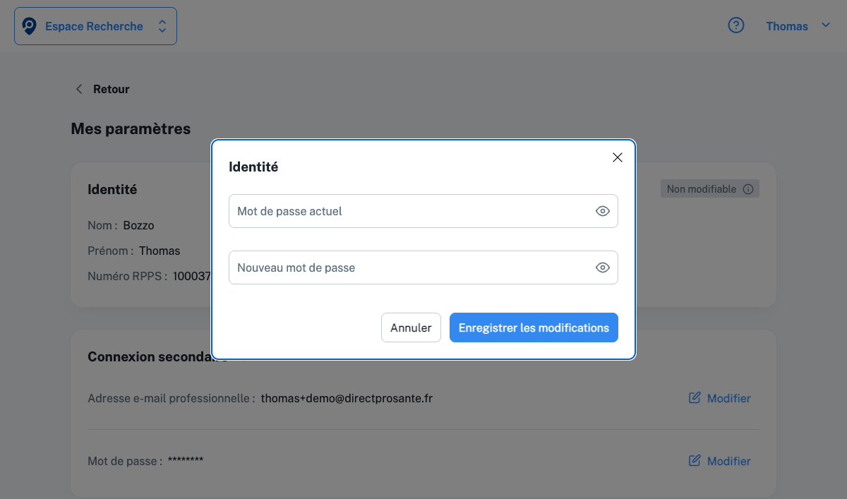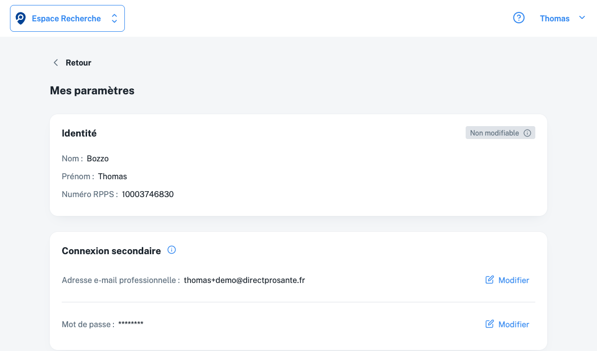La page Mes paramètres regroupe tous les réglages de votre compte DirectProSanté 77. Vous y accédez depuis le menu personnel (clic sur votre prénom en haut à droite, puis “Mes paramètres”).
