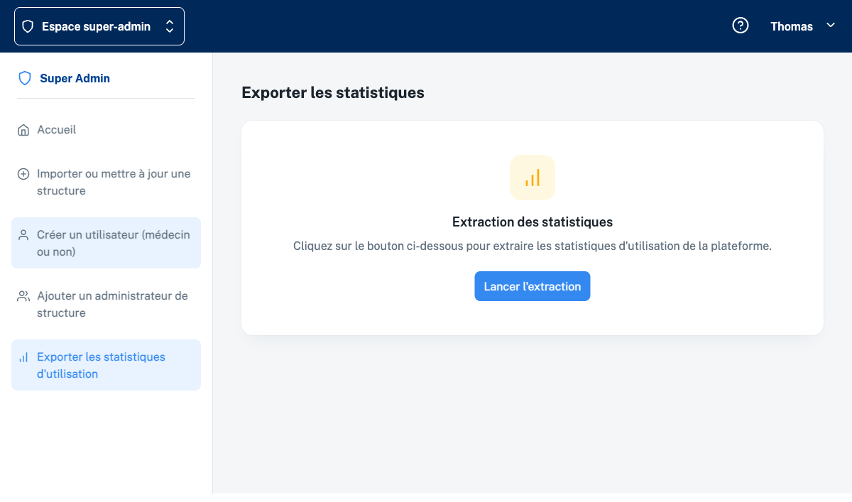 Depuis le sélecteur d’espace en haut à gauche, choisissez Espace super-admin. Dans la sidebar Super Admin, cliquez sur “Exporter les statistiques d’utilisation”.