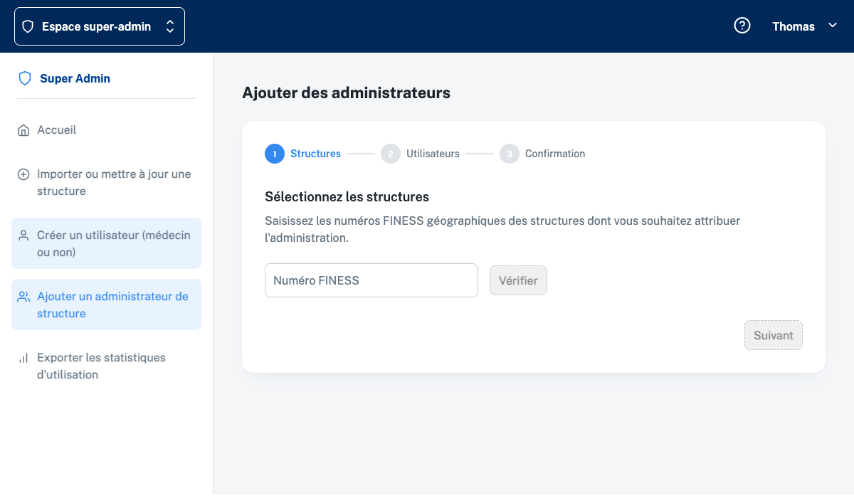 Depuis la sidebar Super Admin, cliquez sur “Ajouter un administrateur de structure”. L’assistant démarre sur l’étape 1 intitulée Structures, avec un champ Numéro FINESS et un bouton Vérifier.
